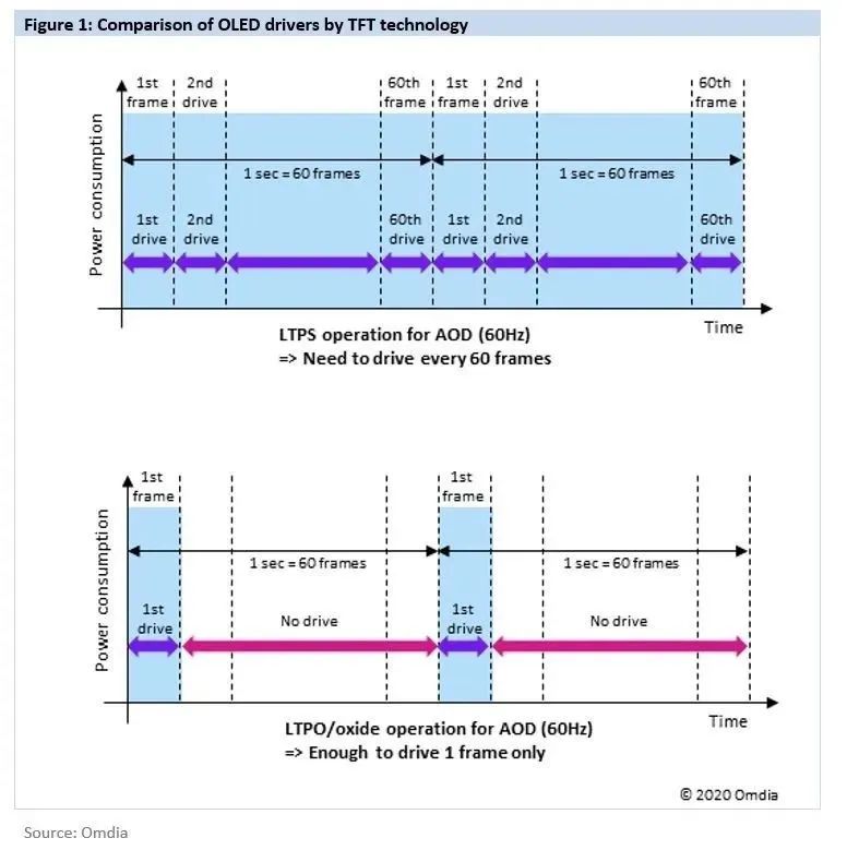 傳統的OLED屏幕,采用的是LTPS(低溫多晶硅)技術,這種技術在以前沒什么問題,但隨著手機屏幕分辨率、刷新率大幅提升后,LTPS技術的短板就顯露出來了,它難以應用于大尺寸基板,因此會帶來更高的功耗,從而大幅削弱了手機的續航能力。